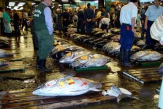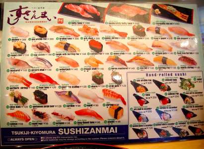 Avoiding being run over by the many crazily, but no doubt purposefully driven forklift-type fish carriers, we search out a sushi restaurant. This proves to be the source of the best meal of the trip. Depending on your point of view, we either have an extremely expensive breakfast or a pretty expensive dinner. From whatever perspective it’s delicious. |